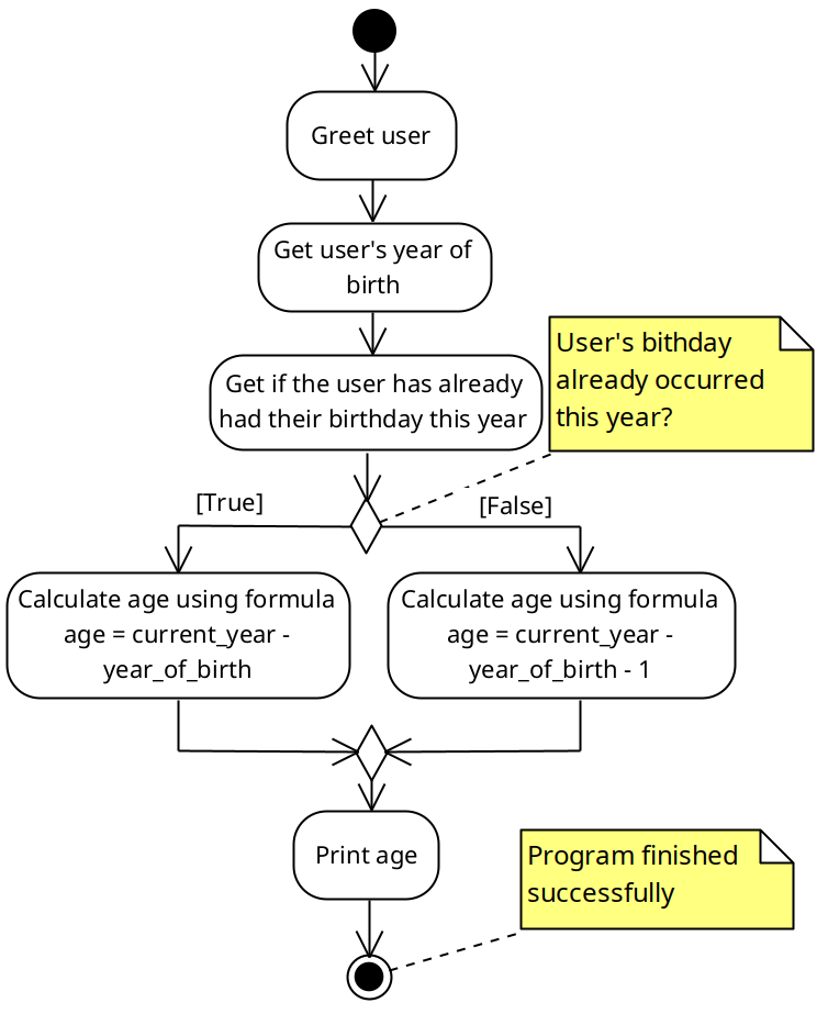 /** * File: hello_conditional.c * Author: Risto Heinsar * Created: 01.09.2014 * Edited: 23.07.2025 * * Description: This is the second hello example showing conditional program * flow. */ // Includes the standard input-output library (printf, scanf) #include <stdio.h> // The program always starts from the main() function int main(void) { // Print the greeting in the terminal. printf("Hello!\n"); printf("This program determines the approximate age of a person\n\n"); // Variable declaration, type int (integer), variable name "year" int year; // Prompt the user and read the year of birth as integer printf("Please enter your year of birth: "); scanf("%d", &year); int hasCelebratedBirthday; printf("Enter 1 if you've already had your birthday this year\n"); printf("Enter 0 if you have not.\n"); scanf("%d", &hasCelebratedBirthday); // Calculating age depending on the user's birthday // Note: There is a bug in this code that only triggers on an edge case. // Can you find it? int age; if (hasCelebratedBirthday) { age = 2025 - year; } else { age = 2025 - year - 1; } // Printing the result printf("You are %d years of age\n", age); // The program finished successfully. Integer 0 indicates success. return 0; } |
