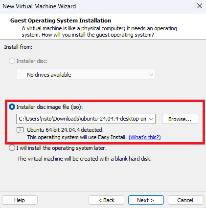Select the Installer disc image option and locate the Linux installation media (iso file) you downloaded.